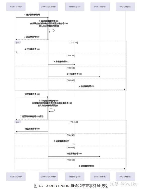 AntDB 5.0 优化了 GTM 事务号和 SnapShot 分发流程,减少了 CN 和 GTM的实时交互,并实现了一种 CN 在本地获取 SnapShot 的方法。AntDB CN/DN申请和结束事务号流程如图 3-7 所示。