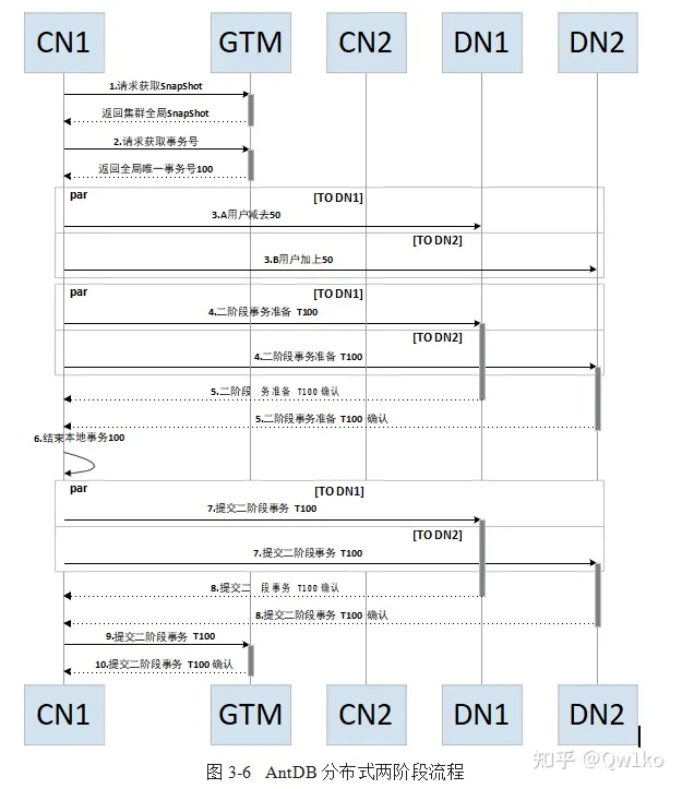 2PC 流程在 AntDB 内部流程如图 3-6 所示。