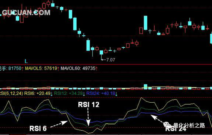 三条不同周期的RSI曲线,分别是RSI 6、RSI12和RSI 24。其中RSI 6的波动最频繁,RSI 12次之,RSI 24的波动最缓慢。在实战中,被用到最多的是RSI 6。