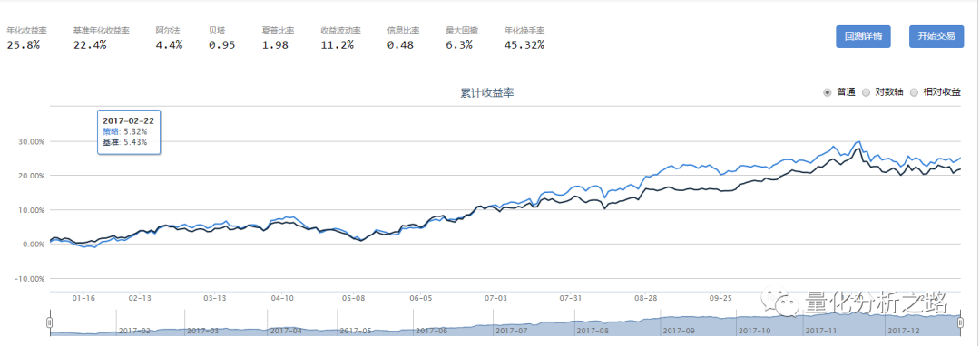 import numpy as npimport pandas as pdimport talibstart = '2016-05-01' # 回测起始时间end = '2016-11-01' # 回测结束时间universe = set_universe('HS300') # 证券池,支持股票、基金、期货、指数四种资产benchmark = 'HS300' # 策略参考标准freq = 'd' # 策略类型,'d'表示日间策略使用日线回测,'m'表示日内策略使用分钟线回测refresh_rate = 1 # 调仓频率,表示执行handle_data的时间间隔,若freq = 'd'时间间隔的单位为交易日,若freq = 'm'时间间隔为分钟# 配置账户信息,支持多资产多账户accounts = {'fantasy_account': AccountConfig(account_type='security', capital_base=10000000)}##买入卖出阈值buy_threshold = 0sell_threshold = 0def initialize(context):wvad = Signal('WVAD') #默认24天context.signal_generator = SignalGenerator(wvad)def handle_data(context):timing(context)
