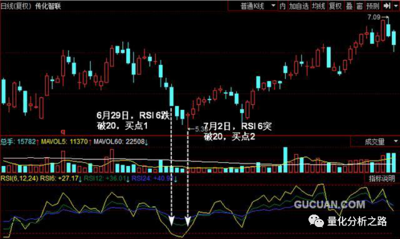 (1)如果RSI 6跌破20的时候成交量萎缩,RSI 6突破20时成交量放大,则验证了空方量衰弱,多方力量复苏的信号。这样的情况下该形态的看涨信号更加强烈。