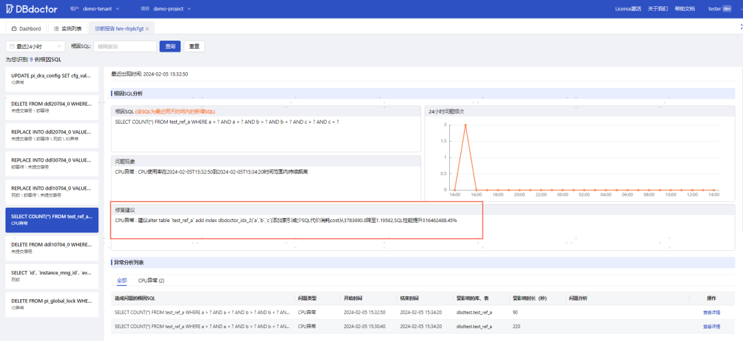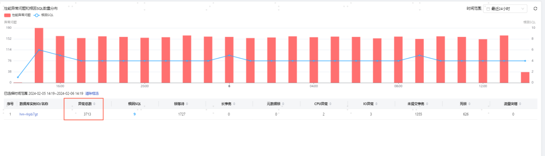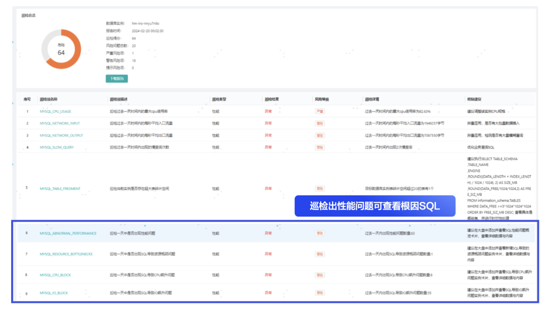 性能CPU、IO等资源问题可量化,快速评估资源指标异常抖动根因。将资源抖动作为巡检项纳入巡检,可更进一步评估实例的健康状况,针对巡检出来的该问题,能准确提示根因SQL。