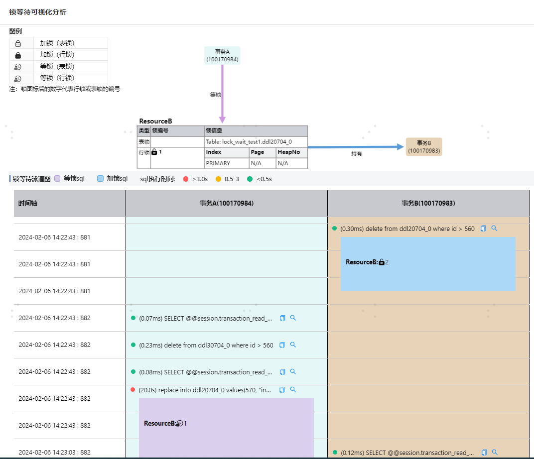 针对锁的问题,DBdoctor可以回放整个加锁过程,通过事务泳道图的方式快速还原现场。DBA可通过图例展示,轻松找到锁的形成过程,将其发给相关业务研发同事,在大促及假期节点等流量洪峰前,提前优化一轮。