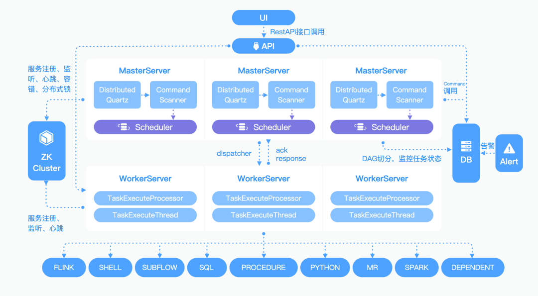去中心化的 master 节点,负责工作流调度、DAG 任务切分、任务提交监控和监听其它节点健康状态等任务