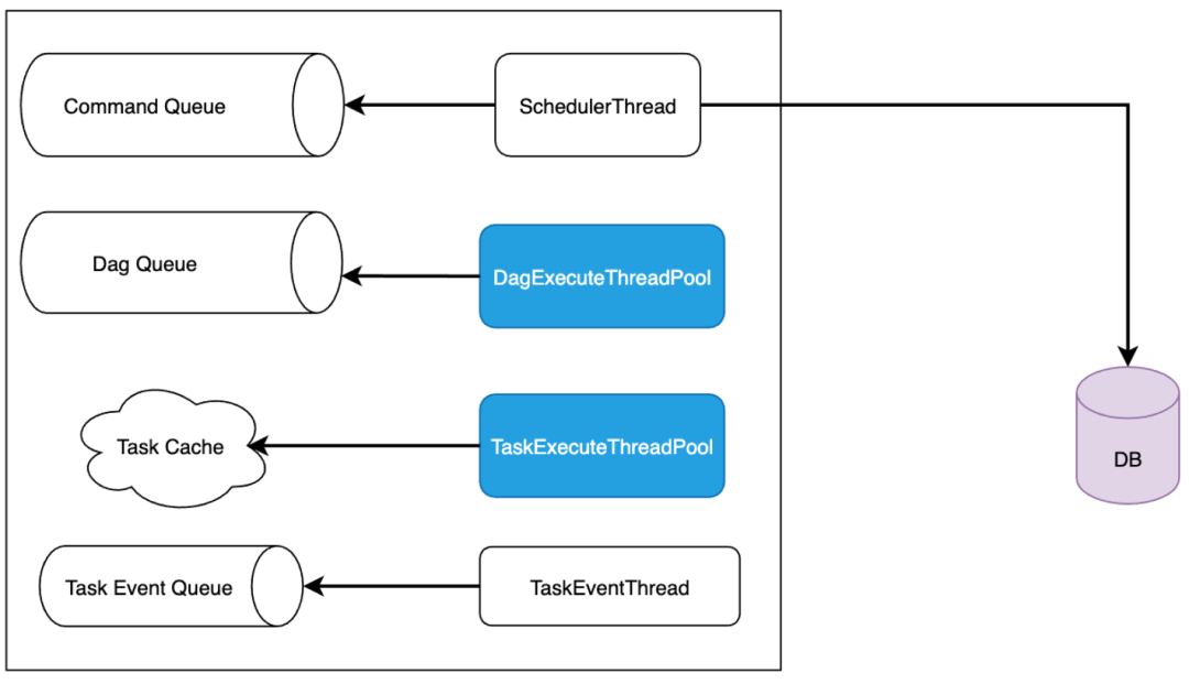DagExecuteThreadPool 从 Command Queue 中取 command,并构造 DAG实例添加到 DAG 队列,进行处理,当前 DAG 没有未执行的任务,则当前 DAG 执行结束