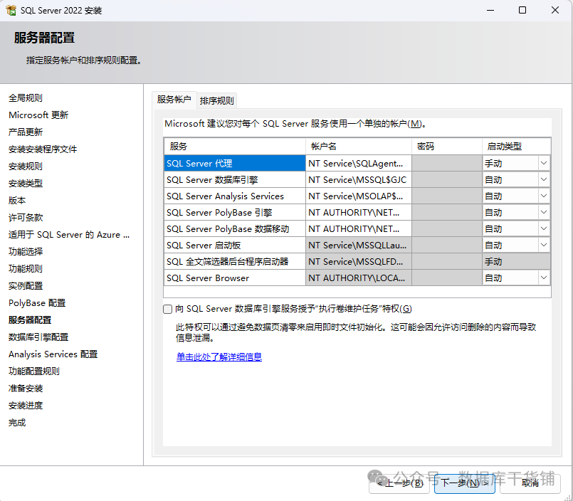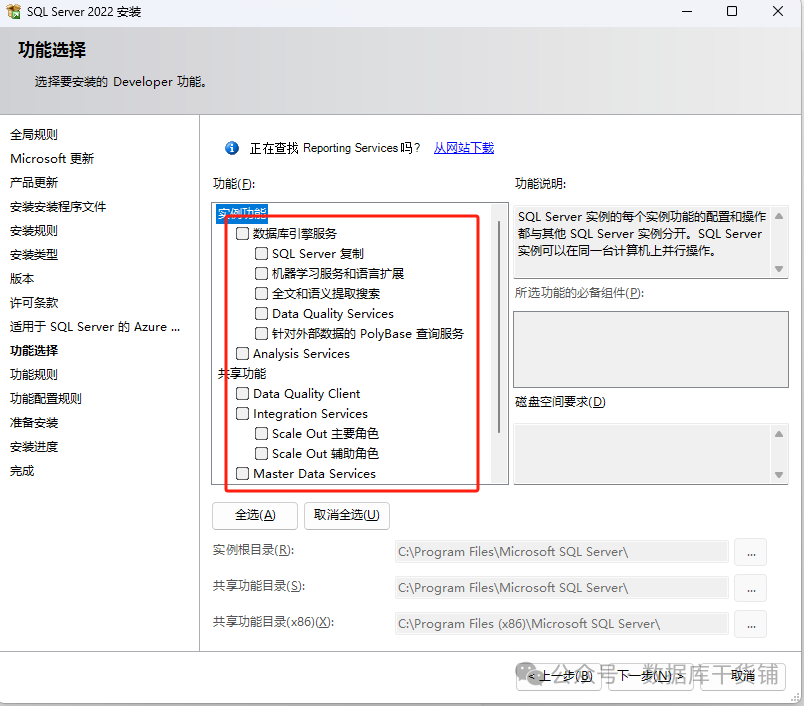如果用到机器学习、数据分析、复制等其他功能时,建议进行自定义安装,选择需要安装的组件。如果不需要则跳过本步骤,直接选择第三部分的安装SSMS