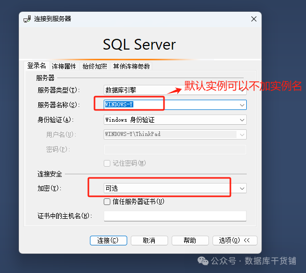 登录数据库时注意自己的实例名,如果自定义实例,则需要手动输入实例名,默认实例可以不输入实例名,例如: