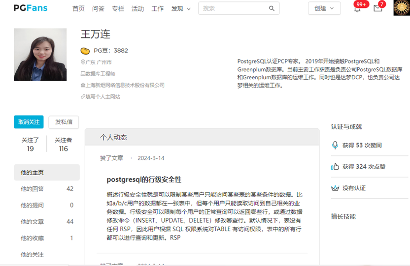 与此同时,我们同样深切怀念在中国社区活跃贡的PG ACE-王万连女士。她凭借对PostgreSQL的热爱与执着,始终积极的参与技术活动,慷慨分享知识与经验。同时,王万连女士还在pgfans问答社区分享了大量技术文章,热心解答其他从业者遇到的问题。她的离世使我们失去了一位热衷分享和感染力的PG ACE伙伴,她的热情、专注和善良将永远留在我们心中。