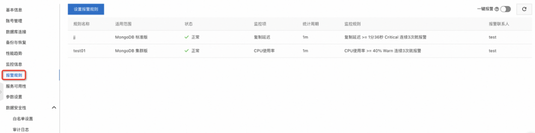 同时,阿里云MongoDB 提供的告警功能也支持为实例的重要监控项设置阈值报警规则。当监控项的值不在设置的阈值范围内时,系统会自动向你发出报警通知,提醒您数据异常,帮助您快速定位问题并进行处理。