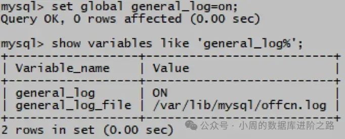 mysql> set global general_log=on; (可同时修改/etc/my.cnf以保存服务重启后状态)