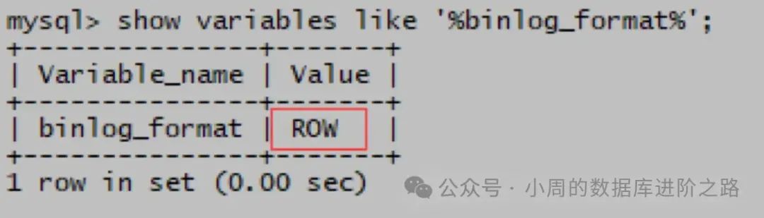 mysql> show variables like ‘%binlog_format%’;