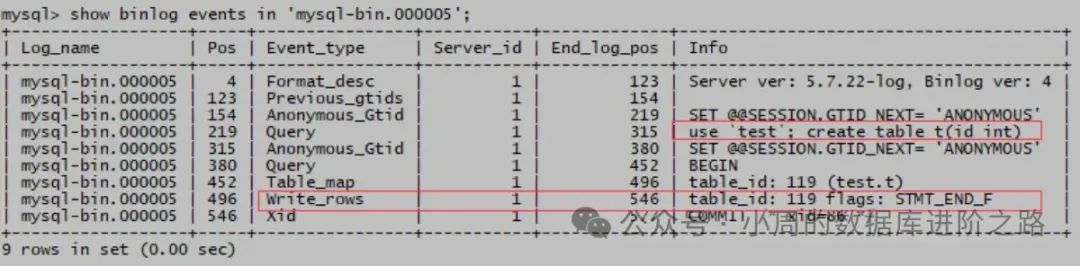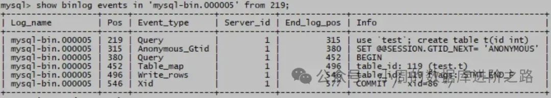 mysql> show binlog events in ‘mysql-bin.000005’ from 219;