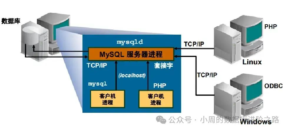 MySQL属于Client/Server结构,Server端程序为mysqld,该服务启动后,Client端程序从本地或者远程连接Server