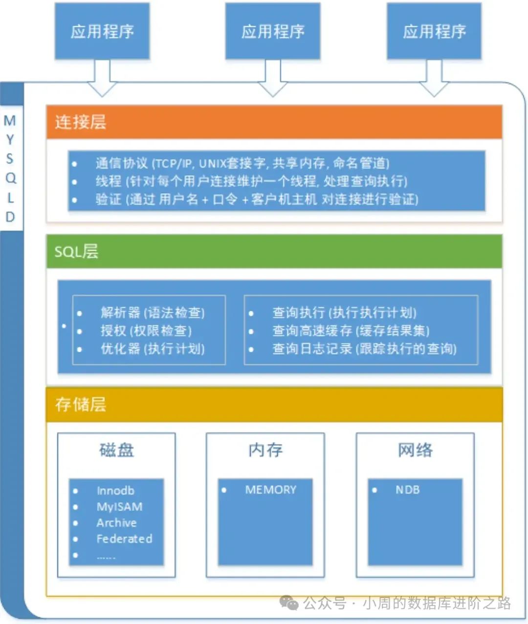 存储层:处理数据存储,MySQL数据可以按不同格式和结构存储在不同物理介质上,也称为存储引擎