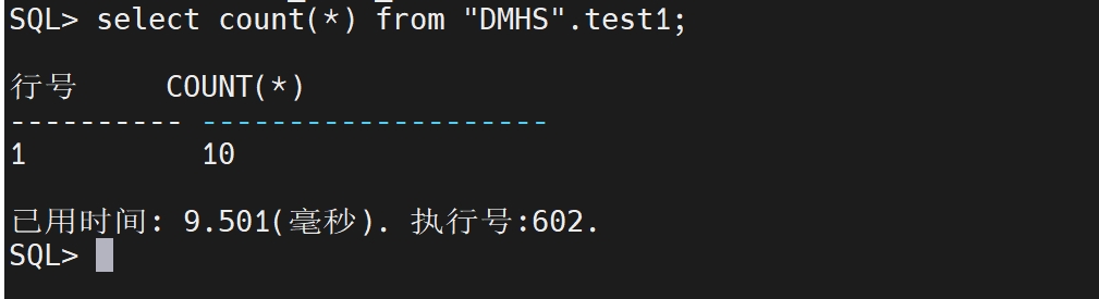 select count(*) from "DMHS".test1;