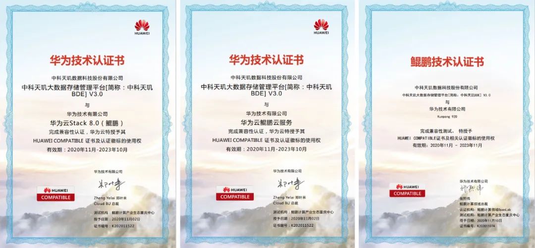 中科天玑自主创新研发的大数据存储管理平台V3.0(简称:中科天玑BDE),与华为技术有限公司Kunpeng920、华为云鲲鹏云服务、华为云Stack8.0(鲲鹏)完成兼容性认证。该认证表明,中科天玑大数据存储管理平台充分满足华为企业的测试使用要求,并获得授权可用于对外展示华为云服务兼容性认可。