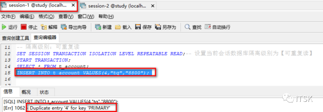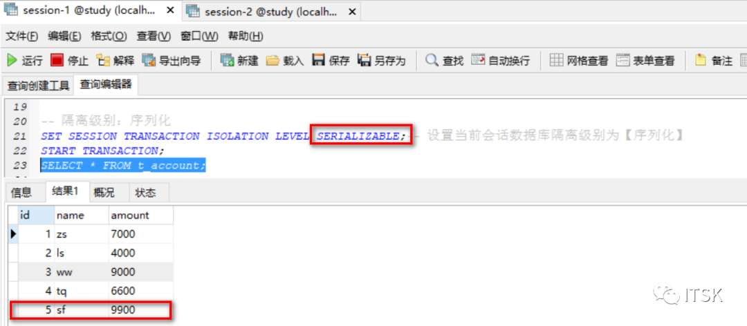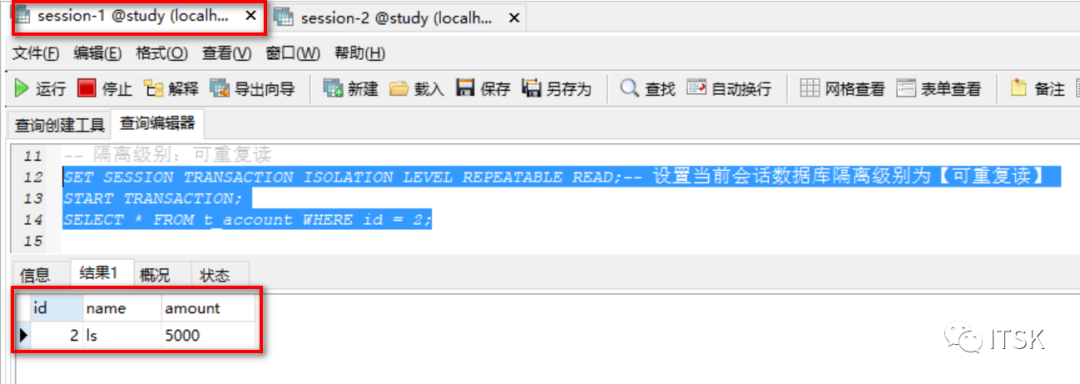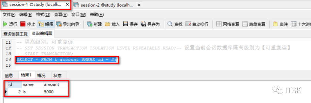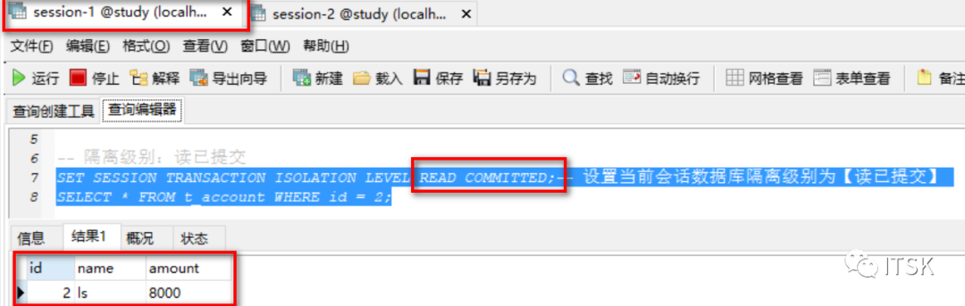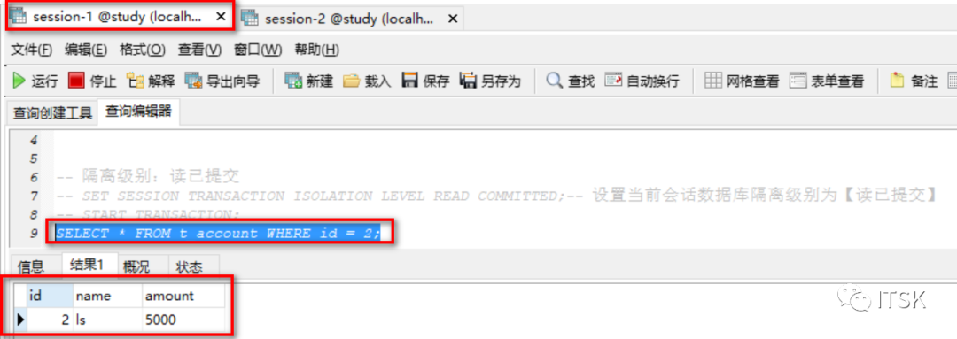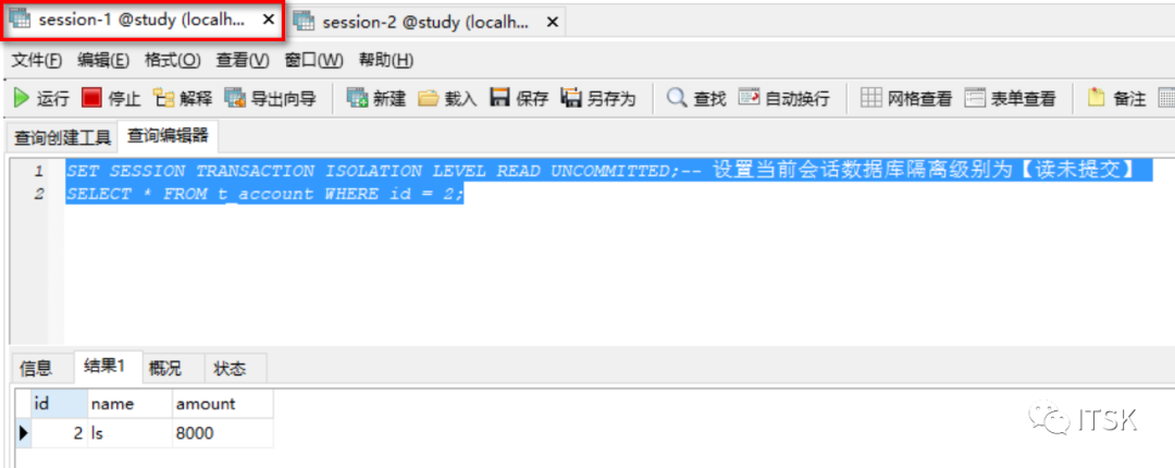 SET SESSION TRANSACTION ISOLATION LEVEL READ UNCOMMITTED;-- 设置当前会话数据库隔离级别为【读未提交】SELECT * FROM t_account WHERE id = 2;