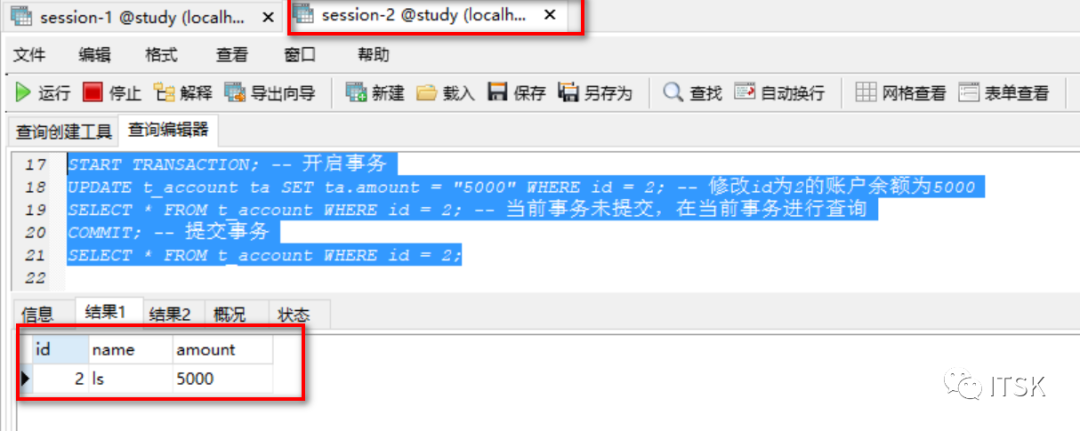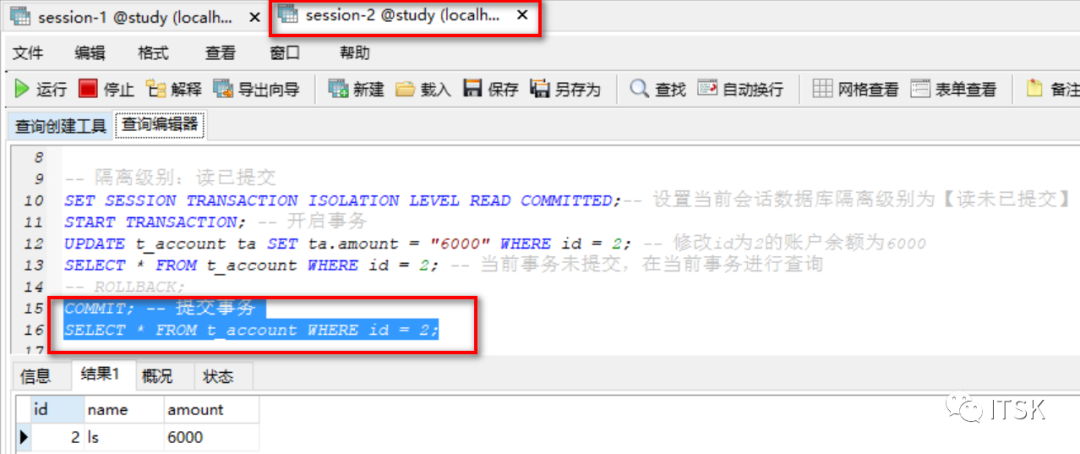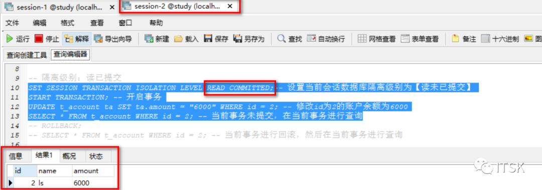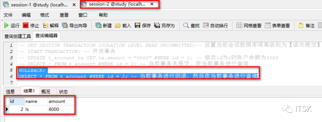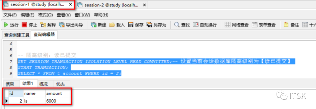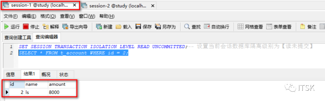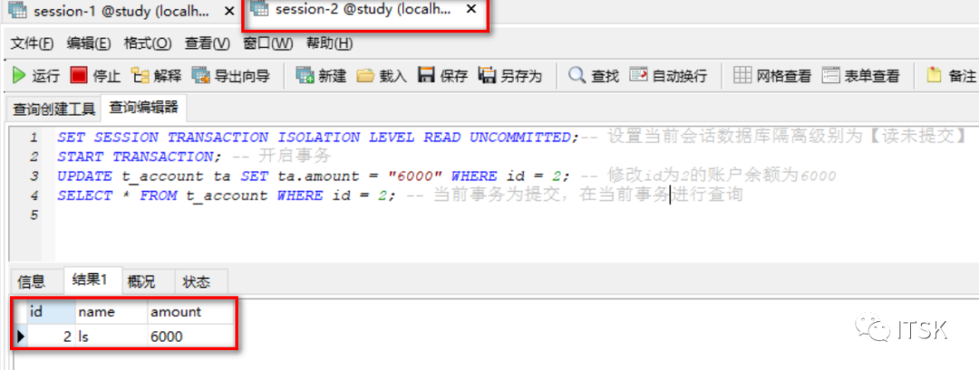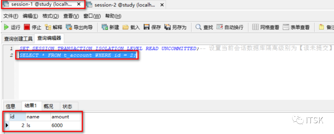 SET SESSION TRANSACTION ISOLATION LEVEL READ UNCOMMITTED;-- 设置当前会话数据库隔离级别为【读未提交】START TRANSACTION; -- 开启事务UPDATE t_account ta SET ta.amount = "6000" WHERE id = 2; -- 修改id为2的账户余额为6000SELECT * FROM t_account WHERE id = 2; -- 当前事务为提交,在当前事务进行查询