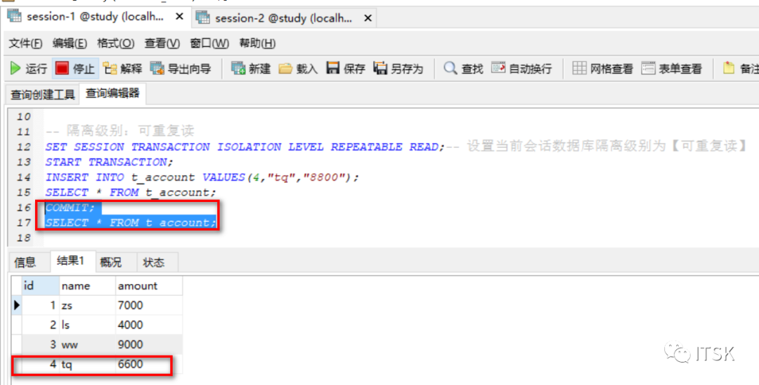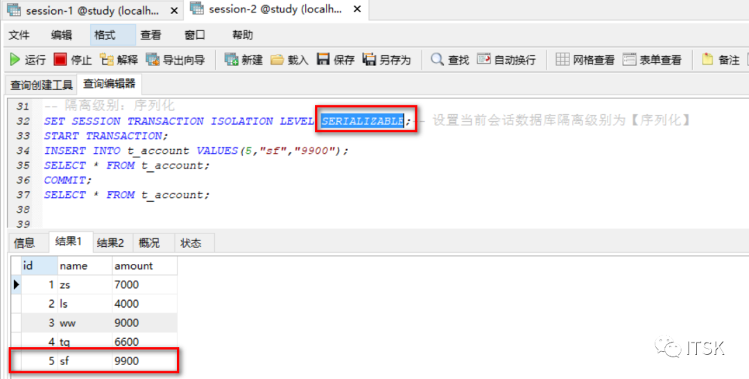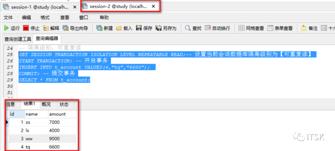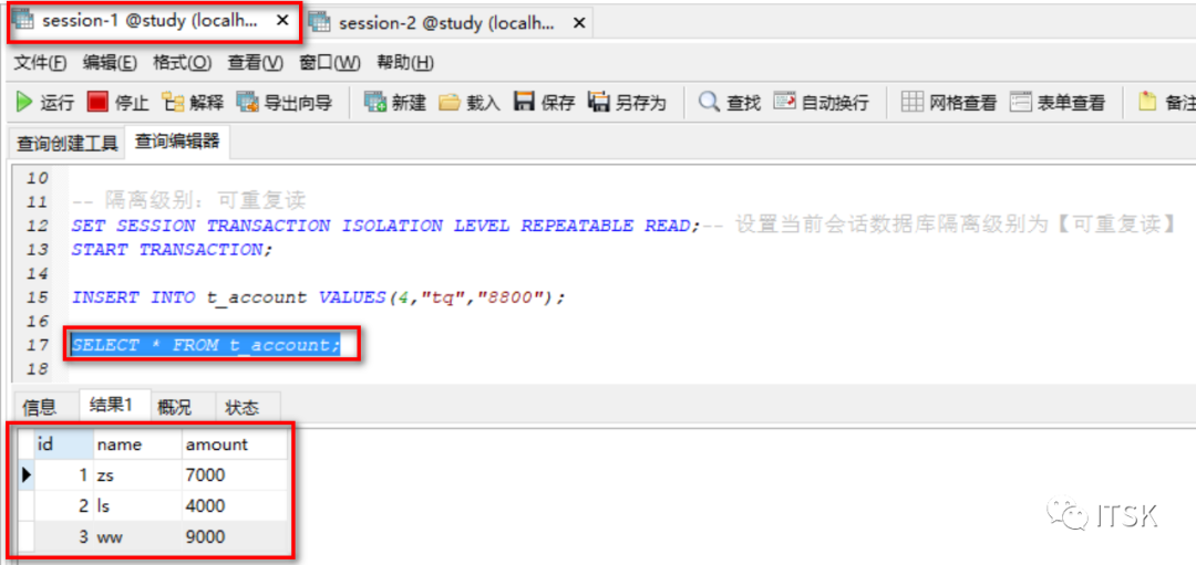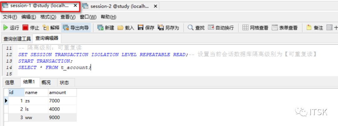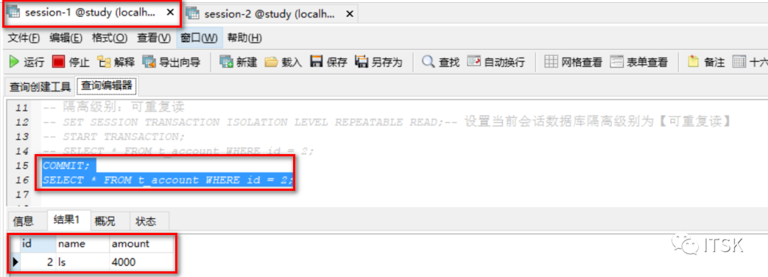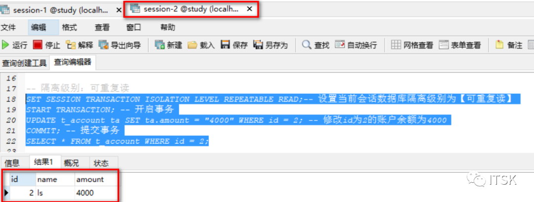 SET SESSION TRANSACTION ISOLATION LEVEL READ UNCOMMITTED;-- 设置当前会话数据库隔离级别为【读未提交】START TRANSACTION; -- 开启事务UPDATE t_account ta SET ta.amount = "6000" WHERE id = 2; -- 修改id为2的账户余额为6000SELECT * FROM t_account WHERE id = 2; -- 当前事务为提交,在当前事务进行查询