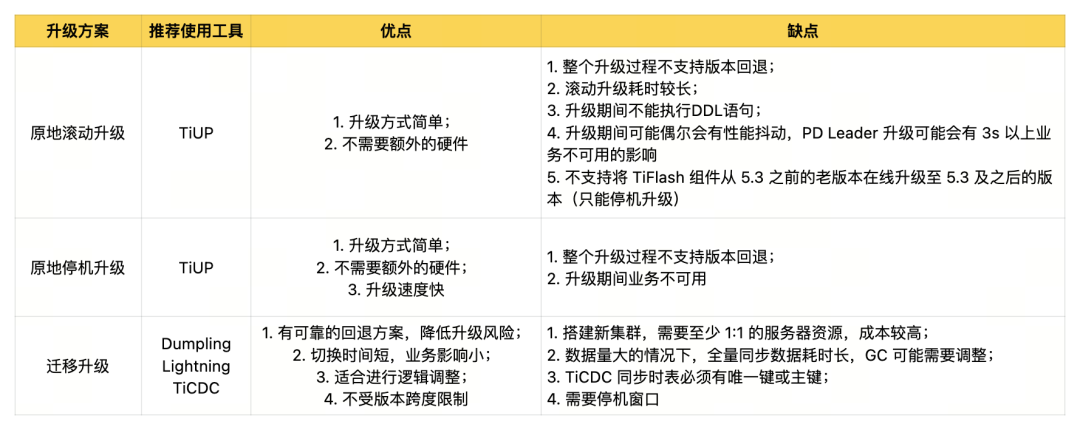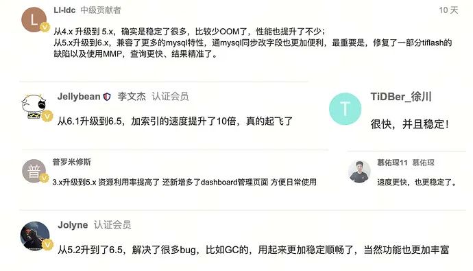 安全性和稳定性的改进意味着数据库出现故障的频率可能会降低,减少了维护工作量。 社区互助即使遇到问题,用户也能够获得及时的帮助和解决方案,降低了维护难度。版本过低时,周边组件支持不一定完善;太旧的版本已经过了 EOL 时间,所以不升级出问题只能自己扛,因为社区的小伙伴没办法帮到你(大家已经没有环境能够帮你复现问题了),详见 TiDB 版本支持时间表 & TiDB 版本规则 ( https://docs.pingcap.com/zh/tidb/stable/versioning ) 新版本的文档和指南通常会更加全面,提供更多的最佳实践和示例,帮助用户更好地维护和优化数据库。