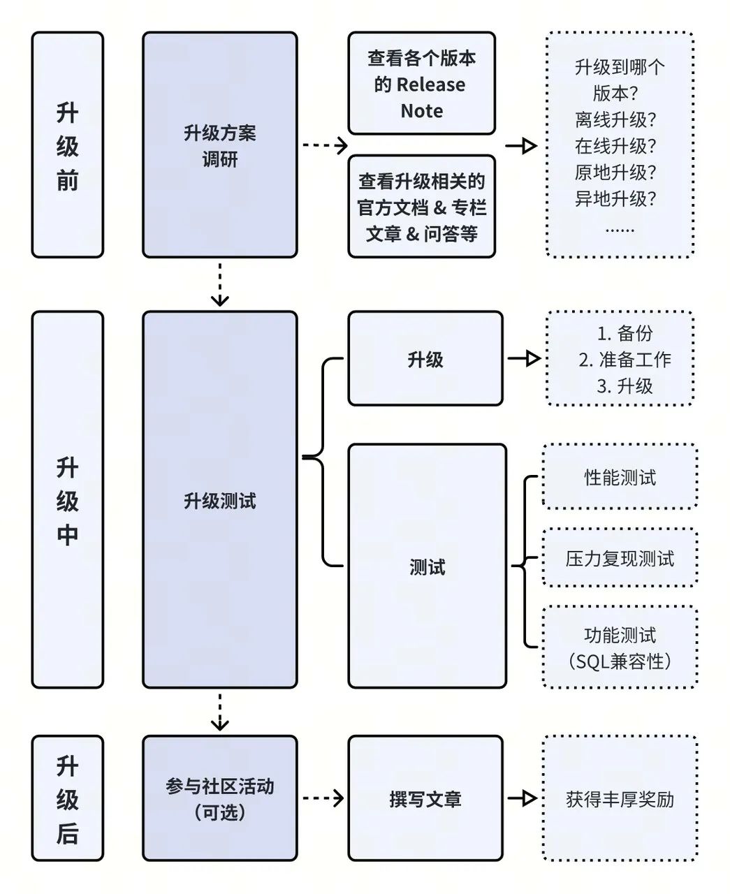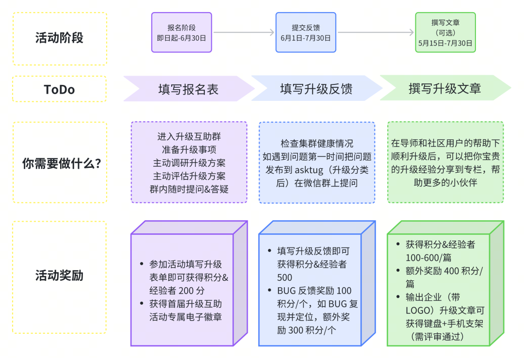报名时间:即日起至 6 月 30 日 升级技术支持:5 月 15 日至 7 月 15 日 提交反馈:6 月 1 日至 7 月 30 日 撰写升级文章(可选,不要求) :5 月 15 日至 7 月 30 日