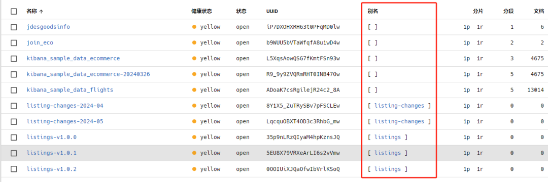 ElasticVue插件中别名显示如下图所示。