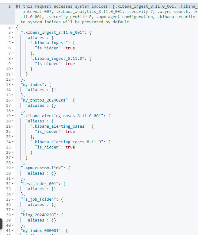 该接口返回的结果更加详细,包含所有索引及其别名信息。适合在应用中使用。