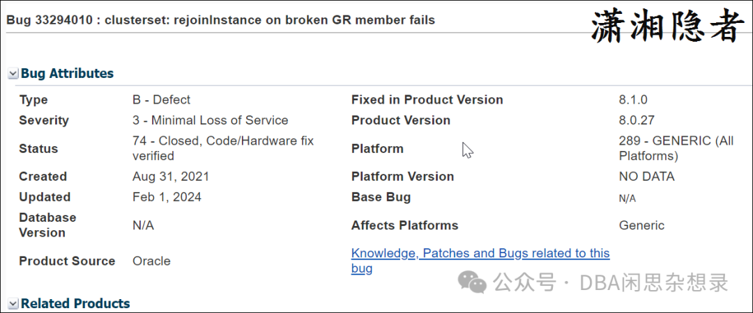 关于这个问题,官方文档The instance 'mysqlNode:3306' is already part of another Replication Group, How To Solve? (Doc ID 2809308.1)[1]中介绍,是因为遇到了Bug #33294010 clusterset: rejoinInstance() on broken GR member fail[2]如下截图所示,这个Bug在8.1.0中已经Fix掉了。