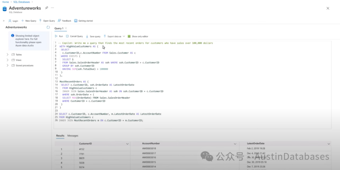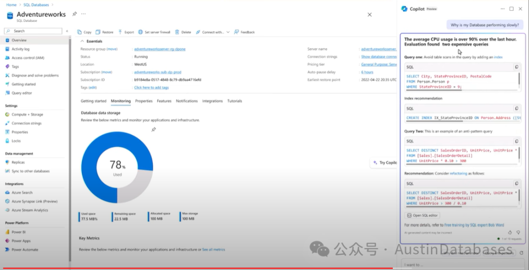 说到最后,本来应该留一个彩蛋,不过没有必要了,这是一个SQL SERVER 的SSMS的操作界面很多DBA都很熟悉,目前SQL SERVER 已经可以通过下图中的命令,直接进行自然语言与SQL SERVER 的交互。Azure可以高度智能化的数据库运维方式,可以在数据库里面直接进行数据库的优化,告知当前数据库的状态,问题以及解决问题的相关建议,并通过各种方式来展示给你。还可以通过人类自然语言来进行需求描述,对SQL进行优化,撰写复杂的SQL,不过 这一切仅仅是一个开始!(老子干不了DBA 还干不了网约车,如果有这样的思维你继续往下看)