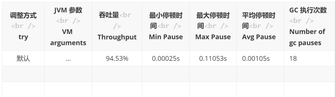 1、首先使用默认的 JVM 参数,使用 GCViewer 分析 GC 日志,记录 GC 效果,以此为基准进行调优