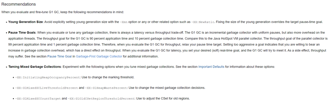 oracle 官网对 G1 收集器优化建议:https://docs.oracle.com/javase/8/docs/technotes/guides/vm/gctuning/g1_gc_tuning.html#recommendations