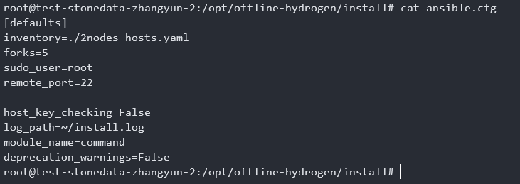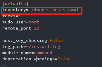 查看或修改ansible.cfg文件中inventory的配置,默认为single-hosts.yaml,需要修改为2nodes-hosts.yaml,其它配置内容不变,修改后配置如下: