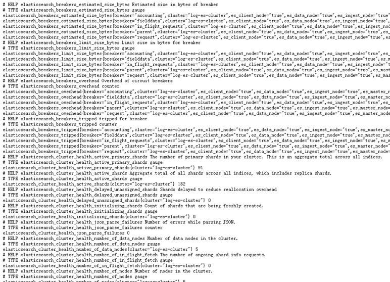 ## 参数说明: --es.uri 默认http://localhost:9200,连接到的Elasticsearch节点的地址(主机和端口)。 这可以是本地节点(例如localhost:9200),也可以是远程Elasticsearch服务器的地址 --es.all 默认flase,如果为true,则查询群集中所有节点的统计信息,而不仅仅是查询我们连接到的节点。 --es.cluster_settings 默认flase,如果为true,请在统计信息中查询集群设置 --es.indices 默认flase,如果为true,则查询统计信息以获取集群中的所有索引。 --es.indices_settings 默认flase,如果为true,则查询集群中所有索引的设置统计信息。 --es.shards 默认flase,如果为true,则查询集群中所有索引的统计信息,包括分片级统计信息(意味着es.indices = true)。 --es.snapshots 默认flase,如果为true,则查询集群快照的统计信息。