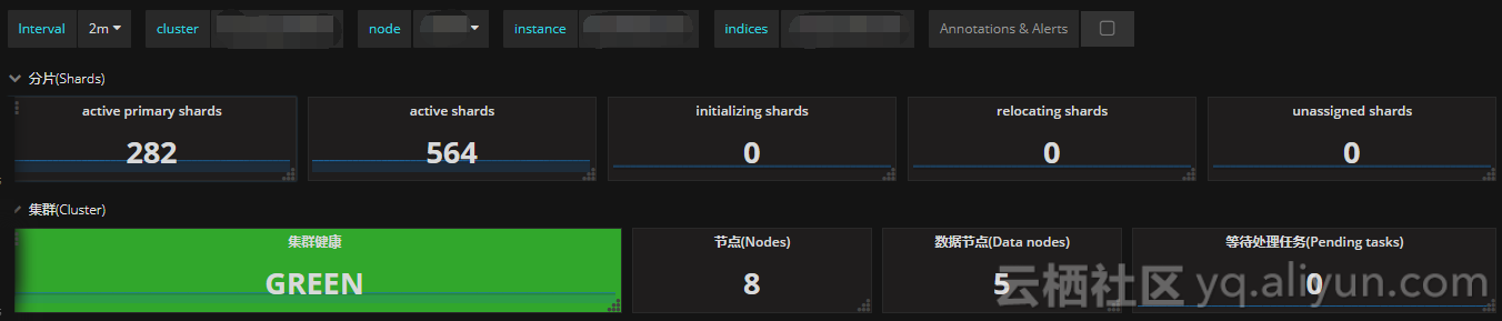 | unassigned_shards | 未分配的分片数,通常为0,当有节点的副本分片丢失该值会增加 | elasticsearch_cluster_health_unassigned_shards |