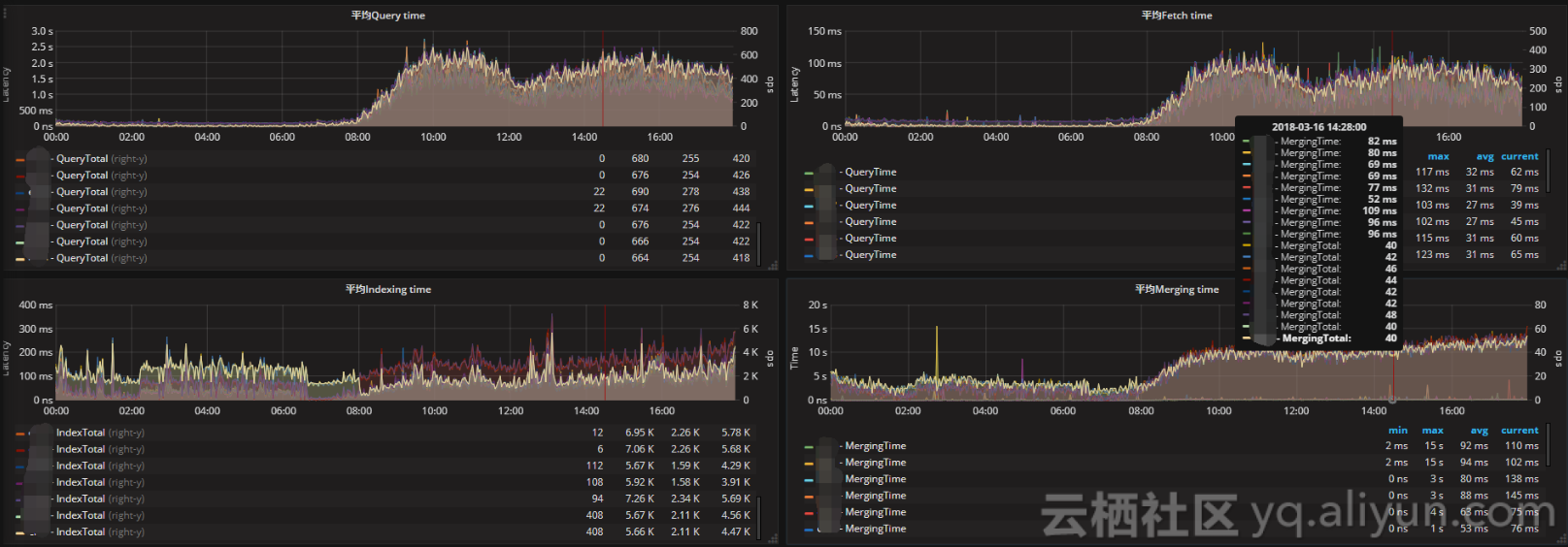 将时间和操作数画在同一张图上,左边y轴显示时间,右边y轴显示对应操作计数,ops/time查看平均操作耗时判断性能是否异常。通过计算获取平均索引延迟,如果延迟不断增大,可能是一次性bulk了太多的文档。