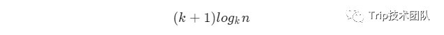 进一步,如果每跨K个节点新建索引节点,即索引层数向上爬高一的概率为1/k,对于查询的时间复杂度可以做如下分析:垂直方向上走过的最大的节点数为索引的高度logk(n),水平方向上每一层索引上最多走k个节点,一共logk(n)级,最多走k * logk(n)个节点,所以查询的路径最多需要查询的节点数为: