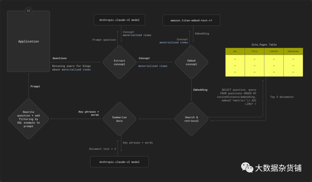 正如我们将在下面发现的,对于我们的用例,RAG 也是相关的,因为我们不仅需要提供表Schema,还需要提供可能的示例查询来解决问题,例如如何识别返回用户或 LLM 应如何处理不太结构化的问题例如“有关物化视图的帖子”。
