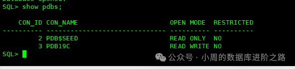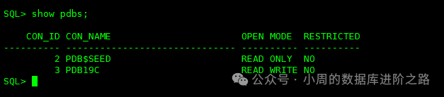 **SEED**: 又叫PDB$SEED,这是创建pdb数据库的模板,一个CDB中只能有一个SEED,SEED中的对象无法添加和修改