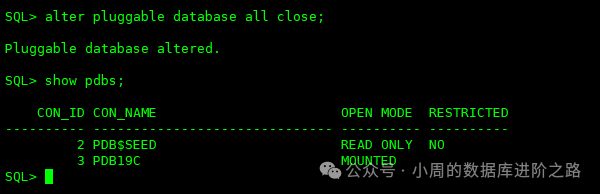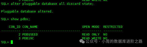 SQL> alter pluggable database all discard state; #关闭
