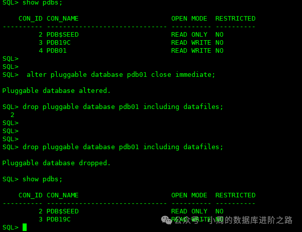 SQL> drop pluggable database pdb01 including datafiles;