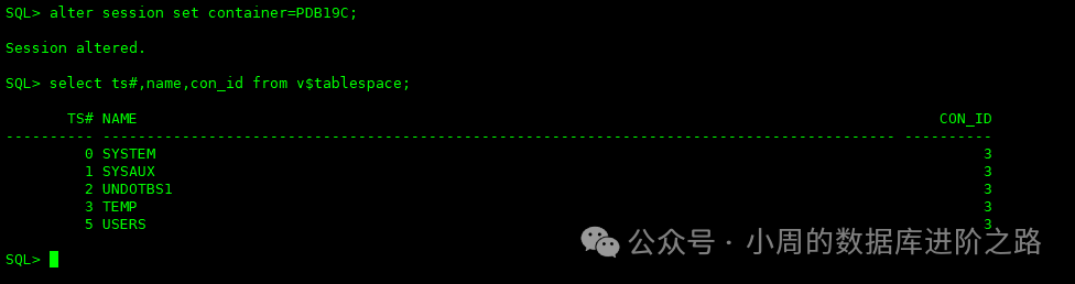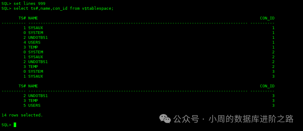 在CDB下可以查看所有的表空间及对应的容器