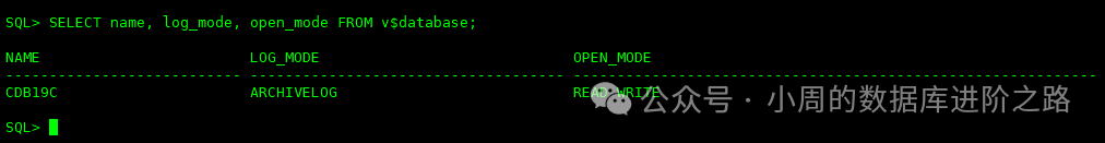 SQL> SELECT name, log_mode, open_mode FROM v$database;