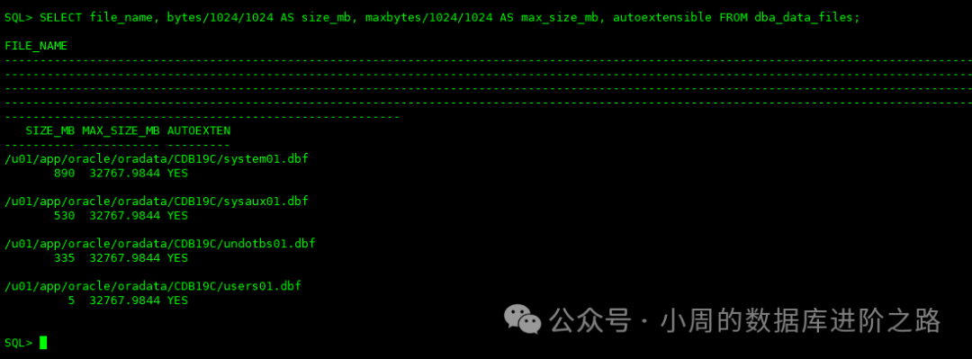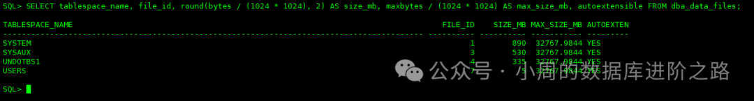 SQL> SELECT tablespace_name, file_id, round(bytes / (1024 * 1024), 2) AS size_mb, maxbytes / (1024 * 1024) AS max_size_mb, autoextensible FROM dba_data_files;