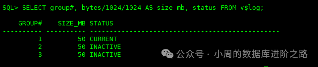 SQL> SELECT group#, bytes/1024/1024 AS size_mb, status FROM v$log;