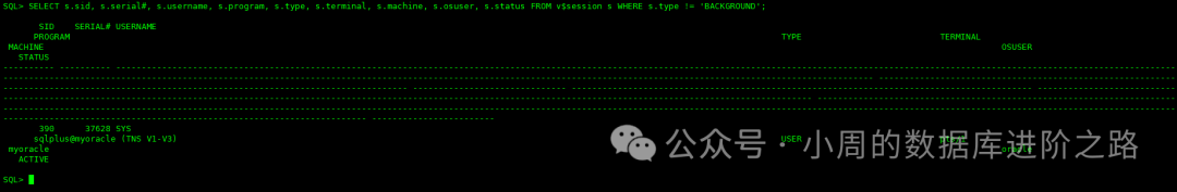 SQL> SELECT s.sid, s.serial#, s.username, s.program, s.type, s.terminal, s.machine, s.osuser, s.status FROM v$session s WHERE s.type != 'BACKGROUND';