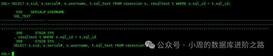 SQL> SELECT s.sid, s.serial#, s.username, t.sql_text FROM v$session s, v$sqltext t WHERE s.sql_id = t.sql_id;