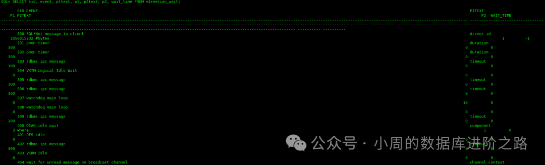 SQL> SELECT sid, event, p1text, p1, p2text, p2, wait_time FROM v$session_wait;