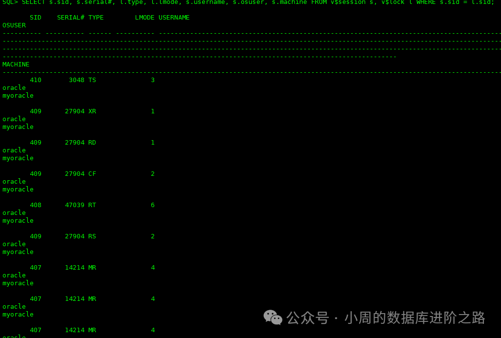 SQL> SELECT s.sid, s.serial#, l.type, l.lmode, s.username, s.osuser, s.machine FROM v$session s, v$lock l WHERE s.sid = l.sid;