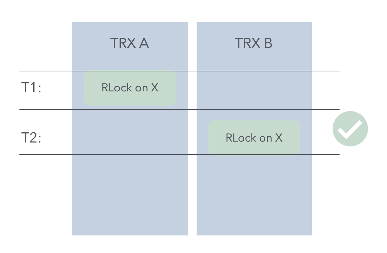 另外,如果我们严格的遵循这个TTL的定义,会引入一个有意思的行为,就是读锁等待读锁,假设有2个用户事务,顺序如下: