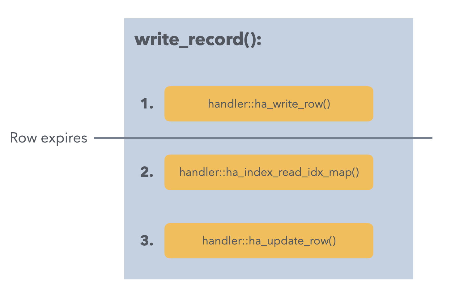 注意这2步并不是在存储引擎中定义的,而是在MySQL Server里的write_record()中实现的:首先调用handler::ha_write_row()向存储引擎尝试插入,如果这里因为冲突失败,则通过handler::ha_index_read_idx_map()读出已经存在于储存引擎的冲突记录,然后经过构造更新后的新记录通过handler::ha_update_row()来向存储引擎更新。这里之所以可以在MySQL Server层实现是因为上述三步都是在记录锁的保护下完成的。第一次插入失败后已经有了记录写锁,从而保证后续两步一定成功。但这一切在有了TTL之后都会不可控,事务的隔离性被打破,因为TTL是随时过期的行为,如下图所示,假如过期发生在第一次尝试插入失败和从引擎读取冲突记录之间,那么引擎会向Server返回Not Found,这直接给原本的Server逻辑干懵逼了:“什么?!我加着锁,你告诉我记录找不到了?” 抱怨完引擎之后Server只好把错误返回给用户,用户也懵逼了:”什么?!我一条INSERT语句,你给我返回can’t find record?!“